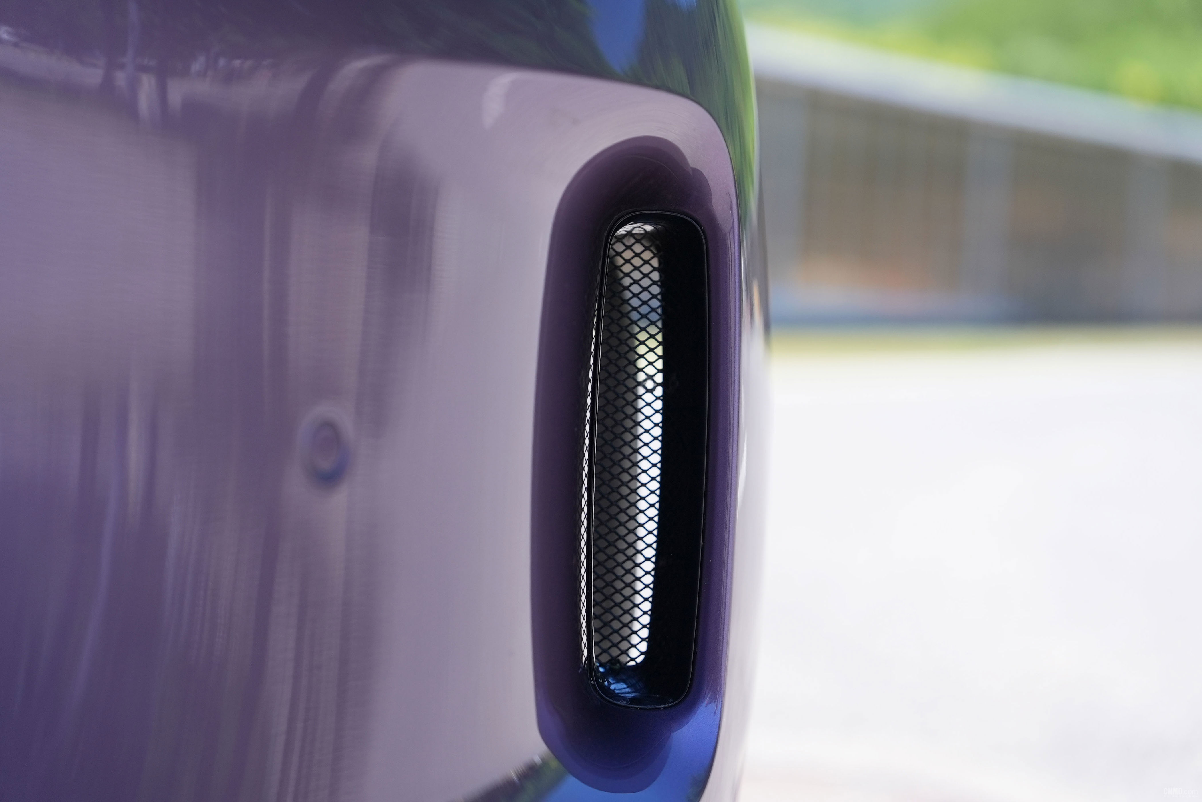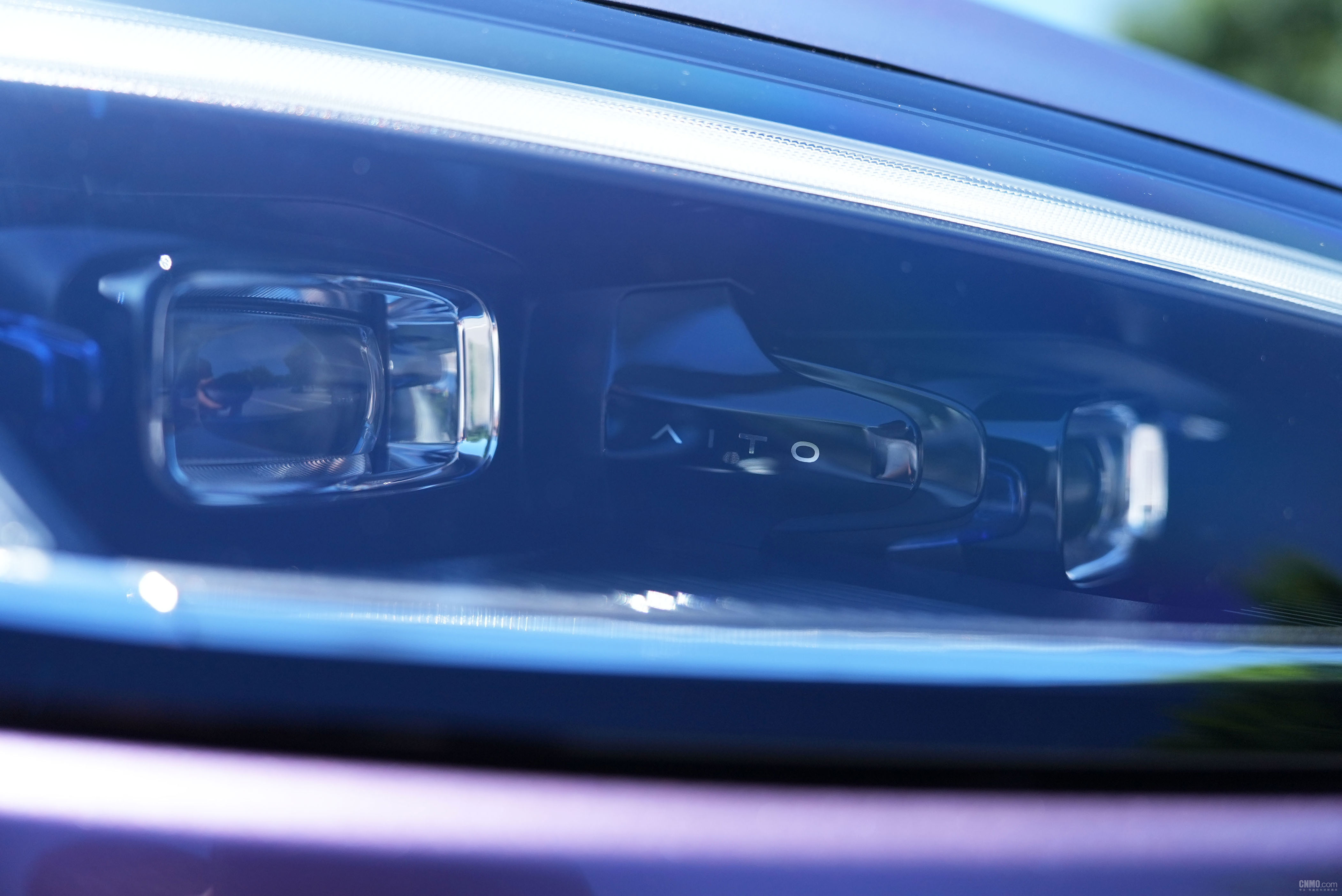 同时,问界新M5 Ultra的很多细节也是值得细细品味的,比如侧面的进气口,紫色搭配网格,还挺有设计感。再比如大灯内部,AITO的标识在内部还是很有点睛之笔的味道,即使是白天去欣赏,也能够感受到工艺之美。
